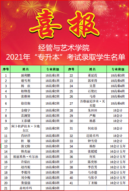 近日,2021年陕西省普通高等教育专升本招生考试录取工作结束,太阳成tyc33455ccwww专升本再创佳绩,共有42名毕业生报名参加,41人被渭南师范公司、商洛公司等本科院校录取,上线率达97.6%。