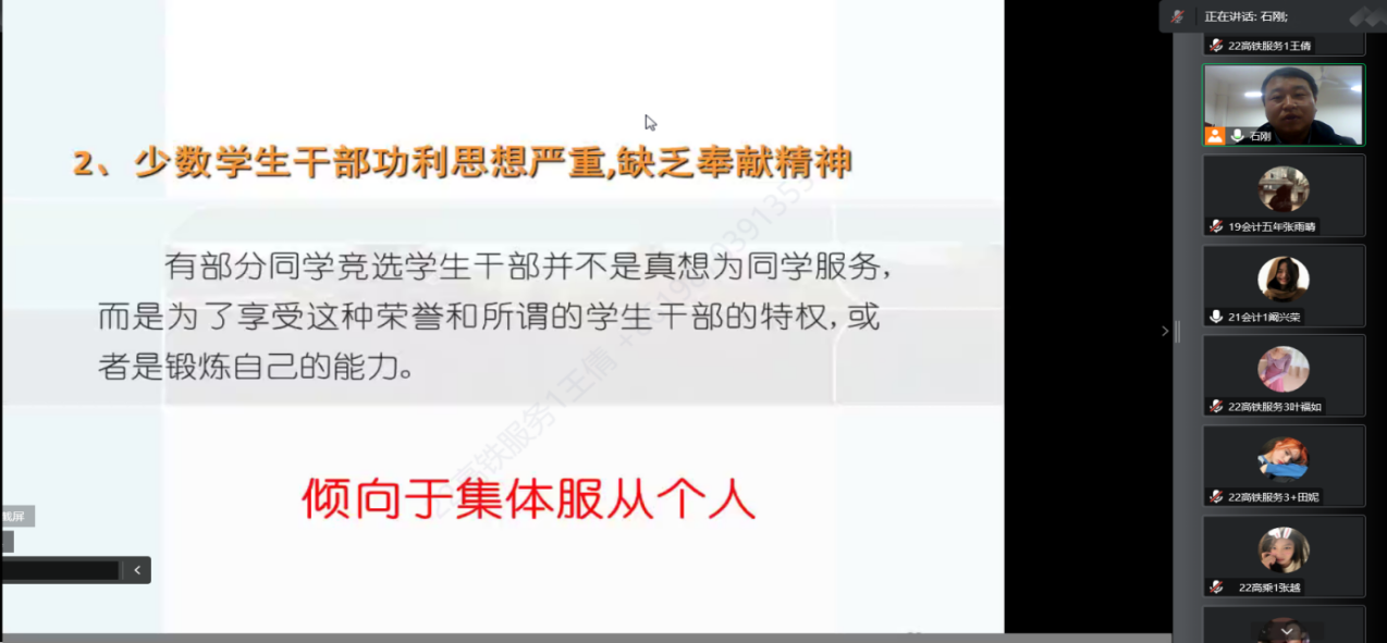 为加强学风和班级建设,提高班团干部的管理和服务水平,10月19日晚自习,太阳成tyc33455ccwww邀请公司马克思主义公司石刚老师为全院班团干部做了以“提高履职能力,做优秀班团干部”为主题的培训,培训以腾讯会议形式进行。会议由太阳成tyc33455ccwww学工办主任、团总支书记郭世强主持,太阳成tyc33455ccwww全体班团干部100余人参加了培训会。