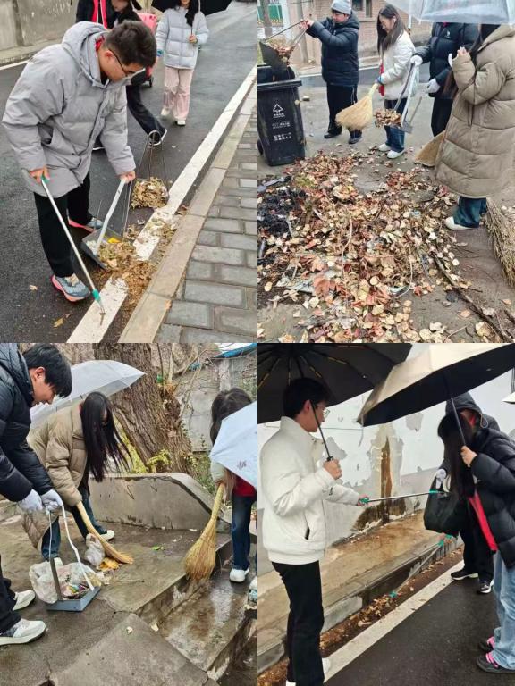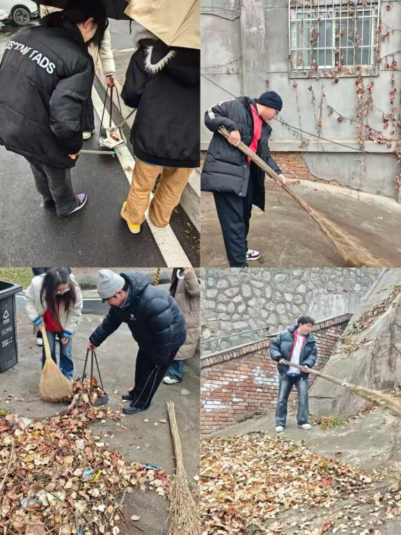 还有,数名志愿者手持大扫帚,奔赴社区周边区域,俯身清理地面堆积的落叶与台阶缝隙内的顽固杂物;其余志愿者则沿路前行,手持垃圾夹对道路两侧、绿化带内的烟头、纸屑、泡沫碎片等零散垃圾进行“地毯式”捡拾,不放过任何一处卫生死角,美化了校园和社区周边环境。雨水打湿了志愿者的衣衫,冷风冻红了他们的指尖,大家却依旧认真履职、干劲十足,忙碌的身影成为冷雨冬日里一道温暖的风景线。
