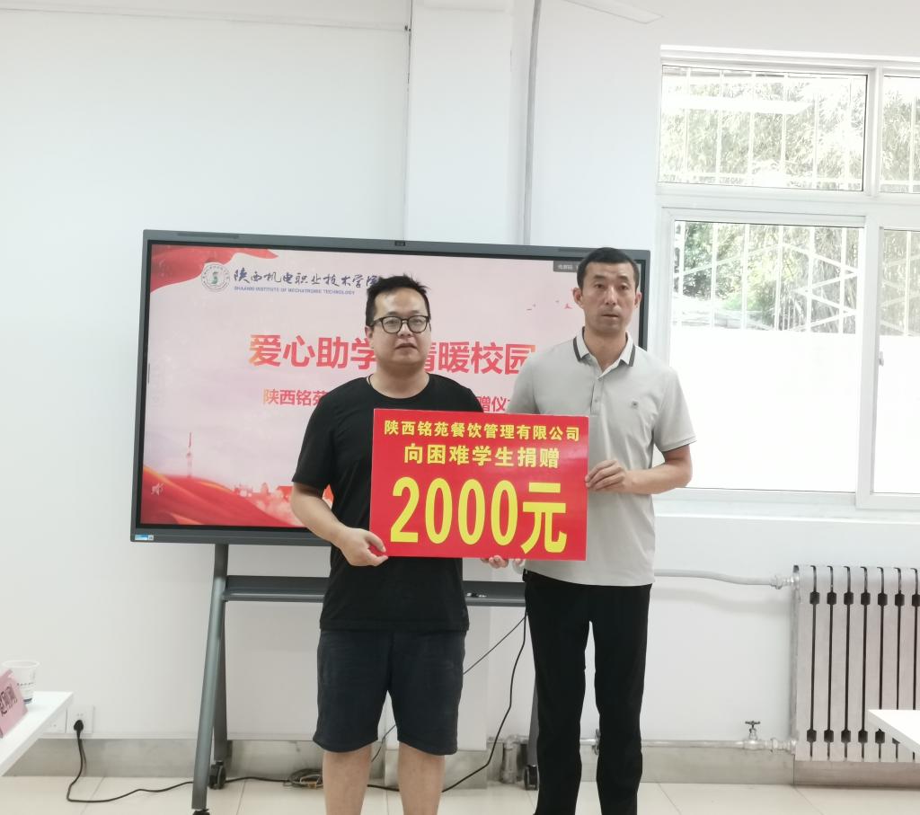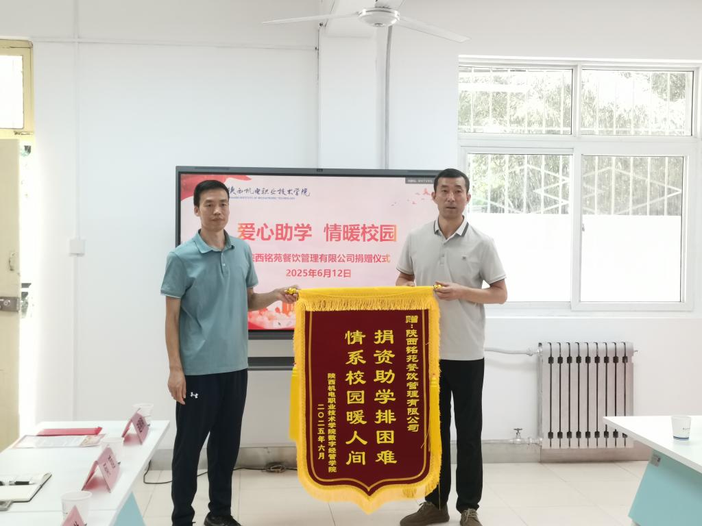 骄阳似火,情暖校园。 2025年6月12日上午,一场温暖人心的爱心助学捐赠仪式在宝福路校区员工“一站式”社区举行。陕西铭苑餐饮管理有限公司慷慨解囊,向太阳成tyc33455ccwww家庭经济困难员工捐赠爱心资金,助力学子成长成才。党委学工部部长、员工处处长王建斌、公司党支部书记孟发军、陕西铭苑餐饮管理有限公司总经理苏小勇及企业代表和太阳成tyc33455ccwww师生代表共同出席捐赠仪式。捐赠仪式由员工处资助管理中心主任白兰主持。
